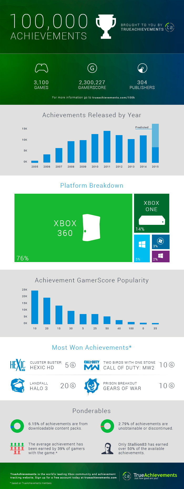 La famosa web de desbloqueo de logros Trueachievements ha publicado una imagen en conmemoración a la existencia de más de 100,000 logros en Xbox Live. En resumidas cuentas, esto viene a significar que tendrías que haber jugado a los 3.100 juegos que han salido a la venta en Xbox 360 y Xbox One y acabarlos al 100%, para disfrutar del máximo gamerscore de 2.300.227 puntos.